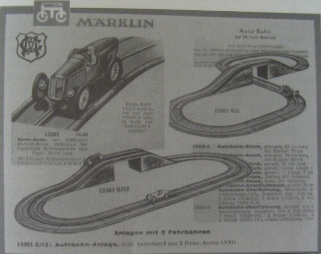 1934 a német Märklin cég is bemutatja a saját autópályáját szintén lemezből készült autókkal 20 voltos motorral de még nem vájatvezetéssel hanem a pályából kiemelkedő vezető sínnel.